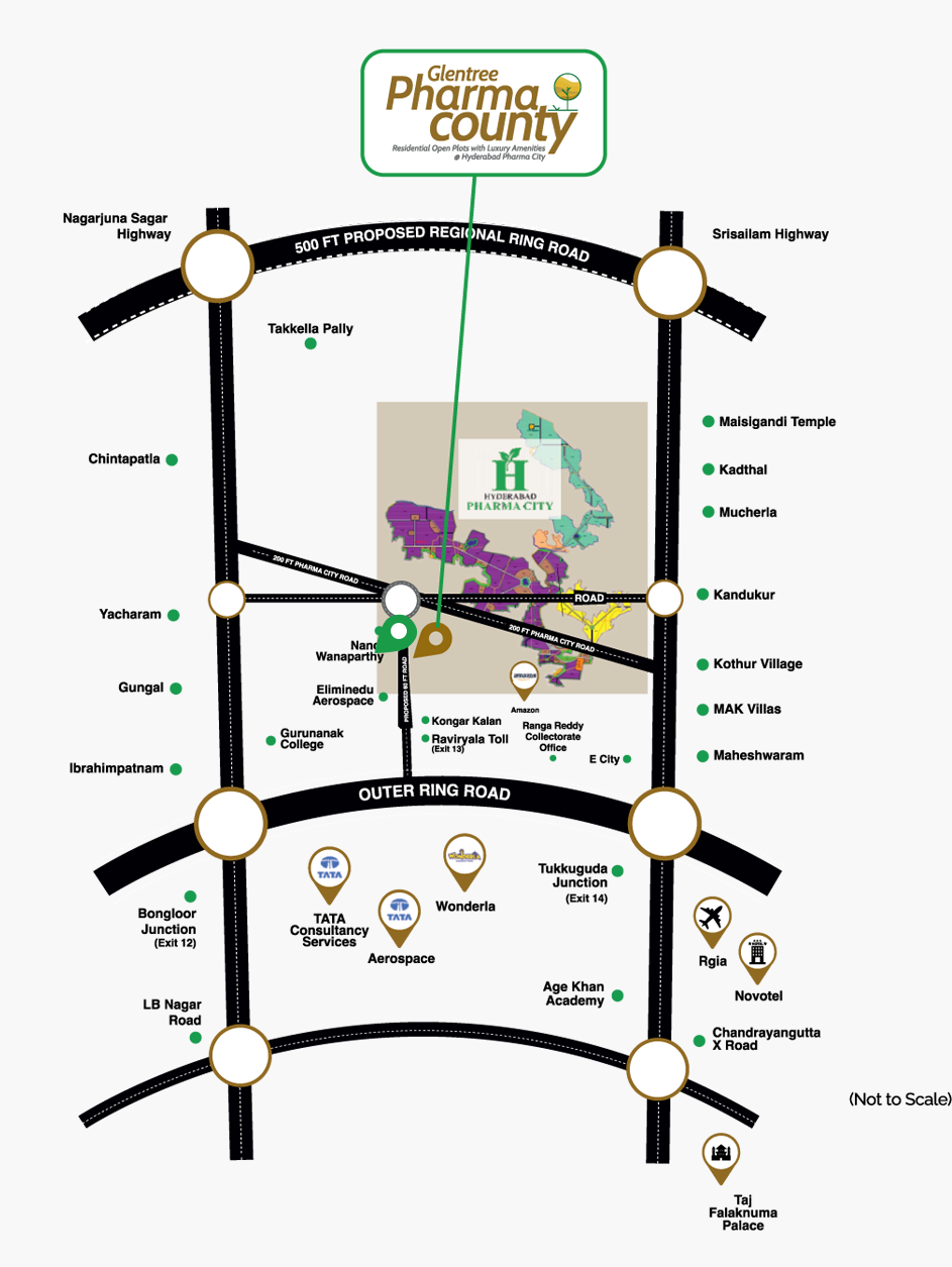 Pharma County, a meticulously planned and DTCP-approved haven, is a utopia brimming with futuristic amenities that surpass your wildest dreams. Nestled exactly 60 km from the bustling metropolis of Hyderabad, this visionary project boasts a plethora of cutting-edge facilities – from underground drainage to underground water supply, from smoothly black-topped roads to an exquisitely crafted welcome arch.